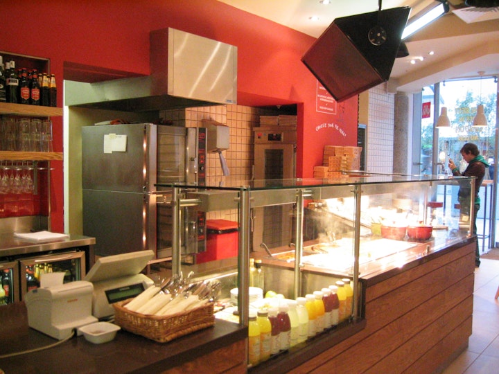 Oak furniture, including the panelled banquet seating and bar counter front, were designed to compliment a chair sourced by Lucy Tauber specifically to represent the brand’s natural, but square, product. Red, mustard yellow and natural table tops were introduced to again accent the cheery nature of the brand, and add a sense of character.