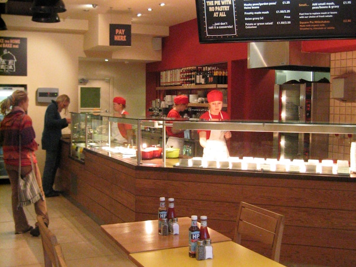 Lucy Tauber Architects were appointed by Square Pie to design their sit-down restaurant and take away Pie and Mash shop at the Brunswick Centre. It marked a considerable move forwards for Square Pie which had specifically focused on takeaway produce. The new site, in the Modernist Brunswick Centre, presented new challenges as a retail unit due its narrow external elevation, deep and split interior space and high ceilings.